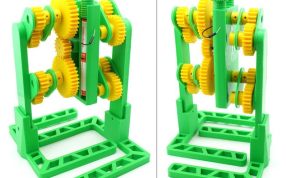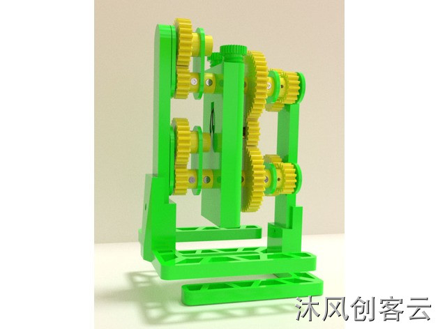 1、将两个小号齿轮装到两个杆的底部。请注意,杆中的孔不对称。将轮子安装到接触3D打印机平台的杆的末端。用螺丝固定轮子。