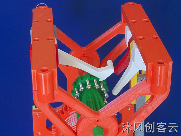 材料用于所有部件的PLA。我认为较软的ABS对于大多数需要自由旋转的旋转部件来说是不太令人满意的。唯一的例外是棘爪,它不应该太“有弹性”。我在解放军做了一个棘爪,但它是一个较软的牌坊。