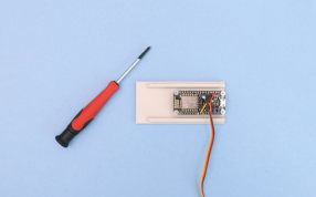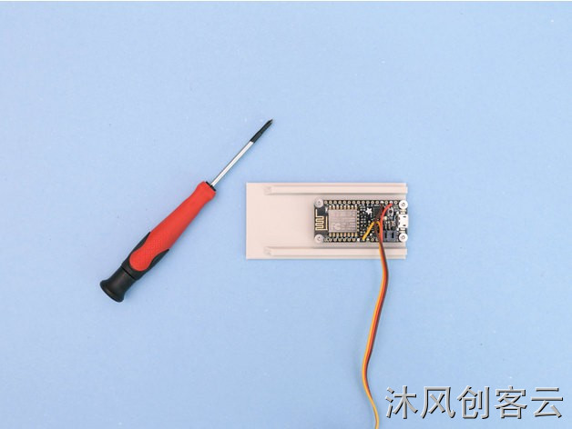 使用舵机附带的舵机单臂。将伺服单臂放在旗帜上,并将安装孔对齐,涂上胶水。使用其中一个小螺钉将标志固定到伺服系统。